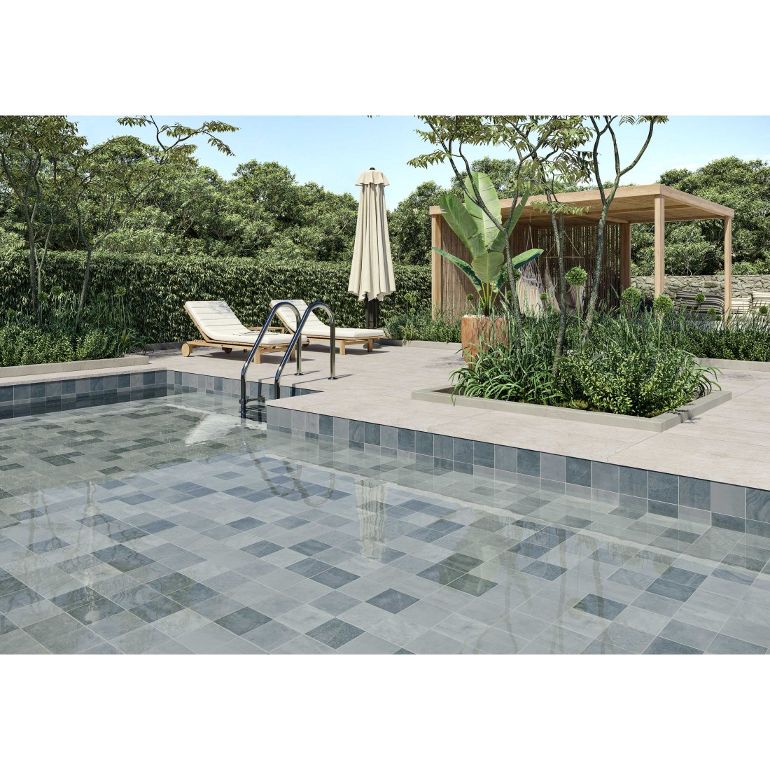 La colección Rimini de azulejos en porcelánico, en formato de 33x33 cm, con un precorte de 15x15 cm, es perfecta para piscinas debido a su resistencia y elegancia. Además, su variedad de tonos, como Verde, Blanco, Azul y Antracita, combinados con tonos claros en el exterior, aportan frescura y elegancia a cualquier espacio acuático. ¡Crea ambientes vivos y enérgicos con la colección Rimini!